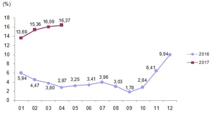 Yurt içi üretici fiyat endeksi (Yİ-ÜFE), 2017 yılı Nisan ayında bir önceki aya göre yüzde 0,76, bir önceki yılın Aralık ayına göre yüzde 7,19, bir önceki yılın aynı ayına göre yüzde 16,37 ve on iki aylık ortalamalara göre yüzde 8,01 artış gösterdi.