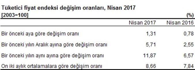 TÜFE’de 2017 yılı Nisan ayında bir önceki aya göre yüzde 1,31, bir önceki yılın Aralık ayına göre yüzde 5,71, bir önceki yılın aynı ayına göre yüzde 11,87 ve on iki aylık ortalamalara göre yüzde 8,66 artış gerçekleşti.