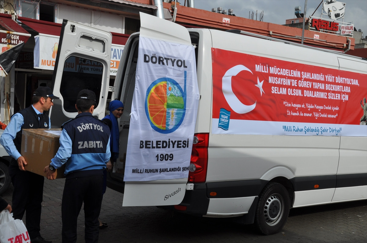 HATAY (AA) - Dörtyol'da, Mardin'in Nusaybin ilçesinde terörle mücadele eden polis ve askerler için düzenlenen kampanyada toplanan günlük yaşam malzemeleri ve yiyecekler ilçeye gönderildi.