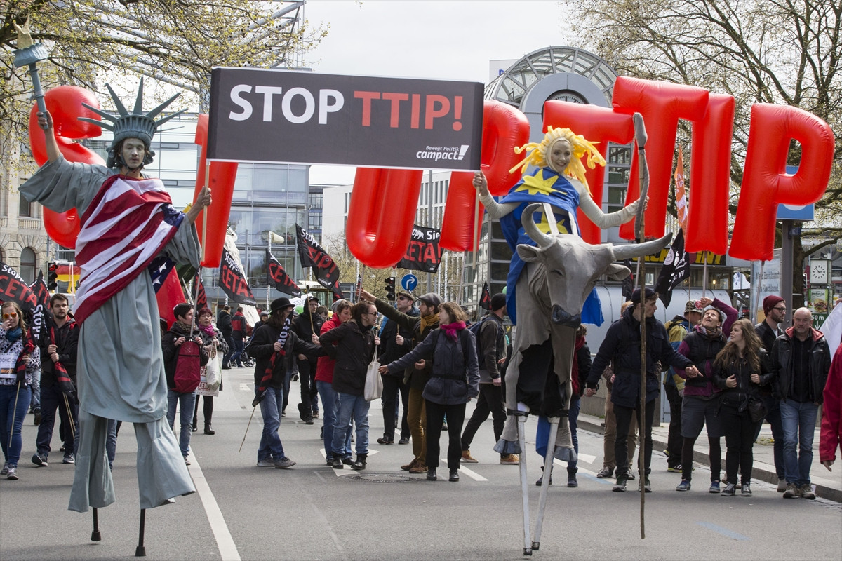 Opera Meydanı’nda toplandıktan sonra kent merkezinde yürüyüşe geçen göstericiler, attıkları sloganlarla, AB ile ABD arasında müzakereleri süren Transatlantik Ticaret ve Yatırım Ortaklığı Anlaşması (TTIP) ve AB ile Kanada arasında planlanan Kapsamlı Ekonomik ve Ticaret Anlaşması’nı (CETA) protesto etti.