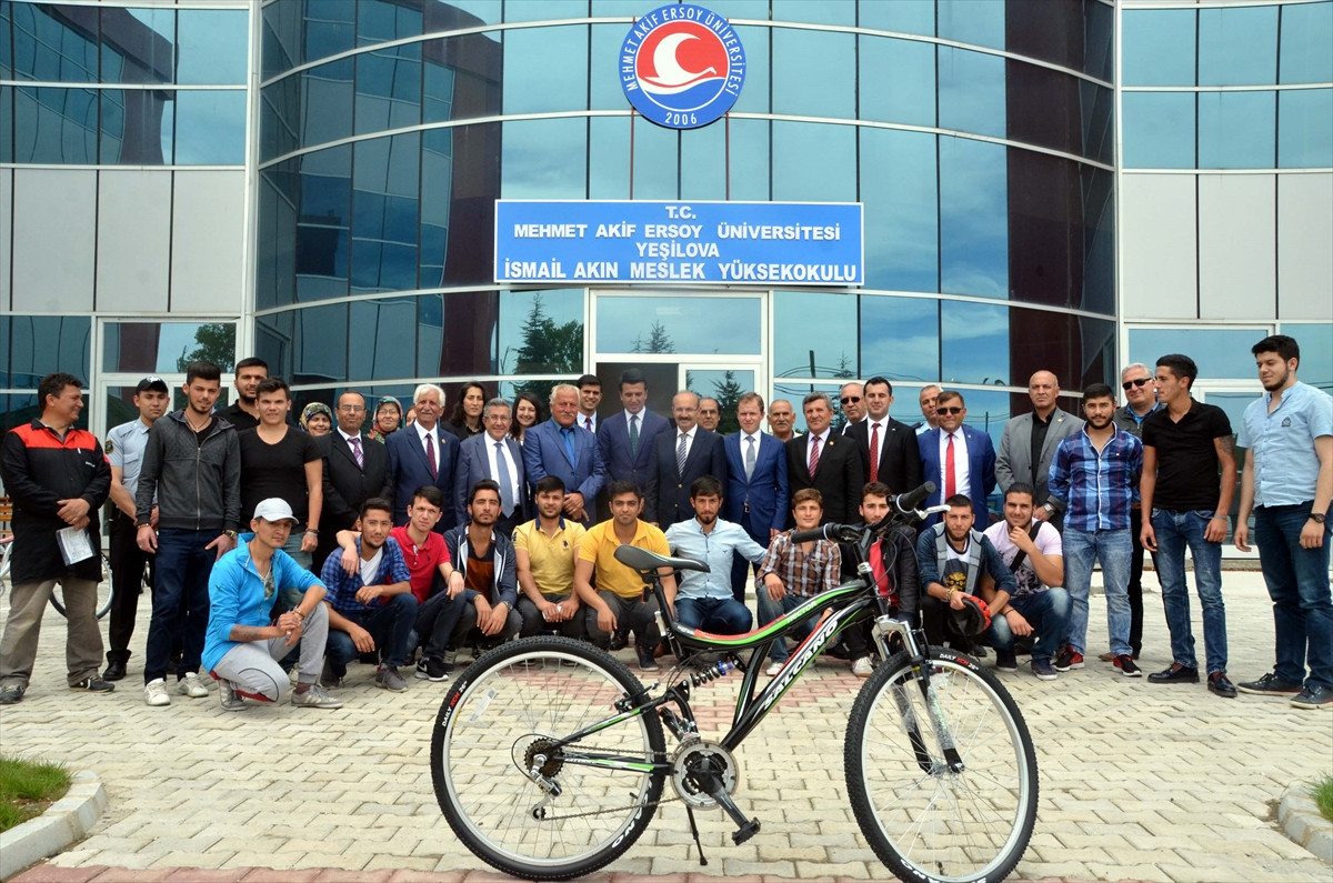 Mehmet Akif Ersoy Üniversitesi (MAKÜ) Yeşilova İsmail Akın Meslek Yüksekokulunda eğitim gören öğrencilere, Vali Hasan Kürklü'nün de katıldığı törenle bisiklet verildi.