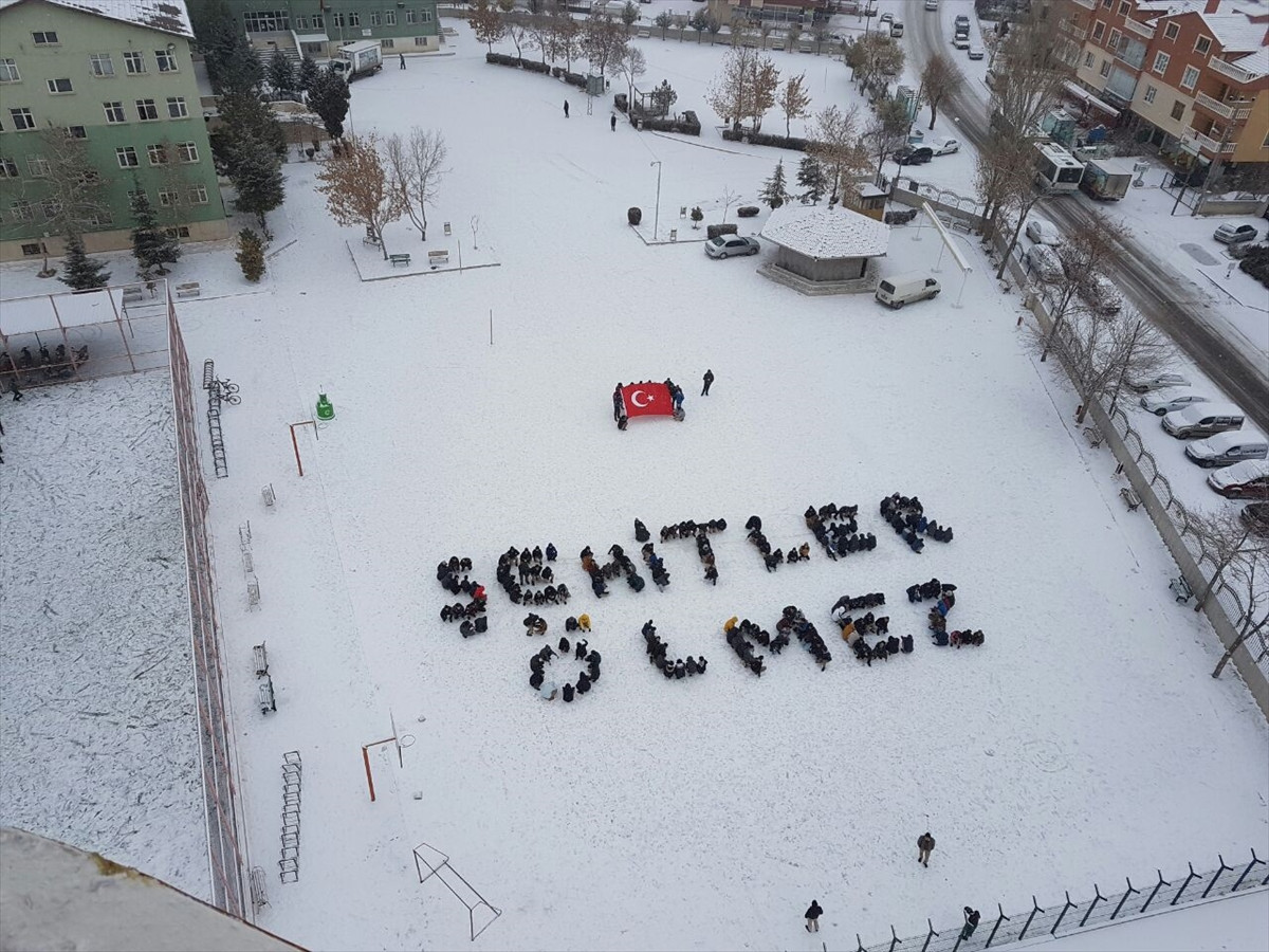 Öğrenciler, karla kaplı okul bahçesine bedenleriyle "Şehitler Ölmez" yazdı.