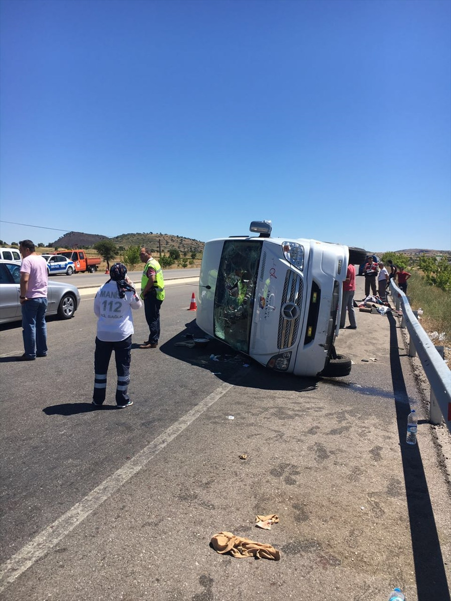 MANİSA ( AA ) - Manisa'nın Kula ilçesinde, öğrenci taşıyan minibüs, bir otomobilin çarpması sonucu devrildi. Kazada, 14 kişi yaralandı.
