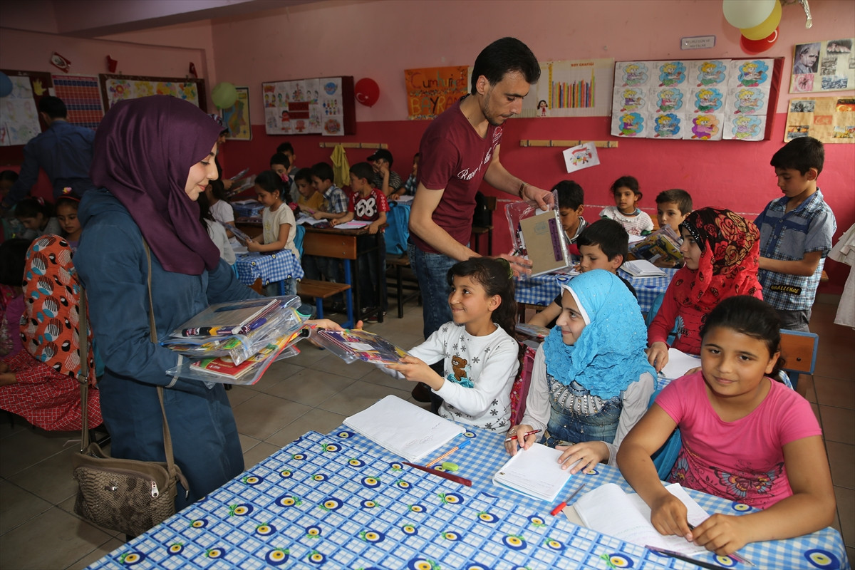 Bu arada Suriyeli öğrenciler, Türk kardeşlerine okullarını paylaştıkları için çiçek verdi.