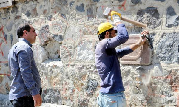 ERZURUM merkez Yakutiye ilçesindeki tarihi Şair Nefi Ortaokulu'nun bahçe duvarının inşaasında kullanılan 19 mezar taşı, arkeologlar eşliğinde söküldü. İl Kültür ve Turizm Müdürü Cemal Almaz, duvardan çıkarılan mezar taşlarının yapımı süren açık hava müzesinde sergileneceğini söyledi.