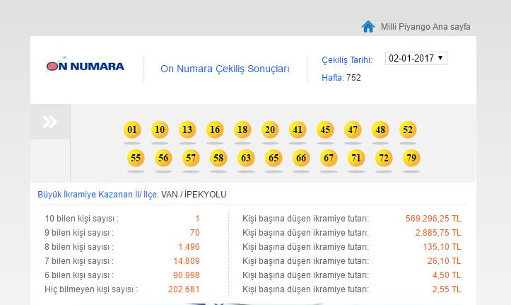 Milli Piyango İdaresi Genel Müdürlüğünce düzenlenen On Numara oyununun 752'nci hafta çekilişi yapıldı. Çekiliş sonucu bu haftanın kazandıran numaraları 1, 10, 13, 16, 18, 20, 41, 45, 47, 48, 52, 55, 56, 57, 58, 63, 65, 66, 67, 71, 72 ve 79 olarak belirlendi. Çekiliş sonuçları itibarıyla 752'nci hafta çekilişinde 10 bilen bir kişi, 569 bin 296 lira 25 kuruş ikramiye kazandı. İşte On numara çekiliş sonuçları hakkında tüm detaylar!
