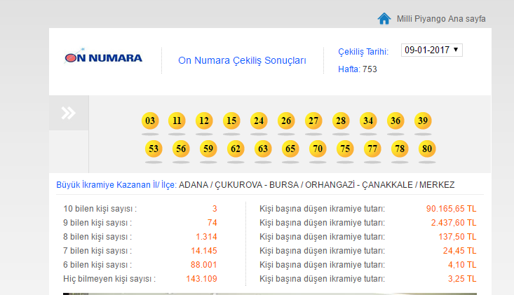 Milli Piyango İdaresi Genel Müdürlüğünce düzenlenen On Numara oyununun 753'ncü hafta çekilişi yapıldı. Çekiliş sonucu bu haftanın kazandıran numaraları 3, 11, 12, 15, 24, 26, 27, 28, 34, 36, 39, 53, 56, 59, 62, 63, 65, 70, 75, 77, 78 ve 80 olarak belirlendi. Çekiliş sonuçları itibarıyla On Numara oyununun 753'ncü hafta çekilişinde 10 bilen 3 kişi, 90 bin 165 lira 65'er kuruş ikramiye kazandı. İşte On numara çekiliş sonuçları hakkında tüm detaylar!