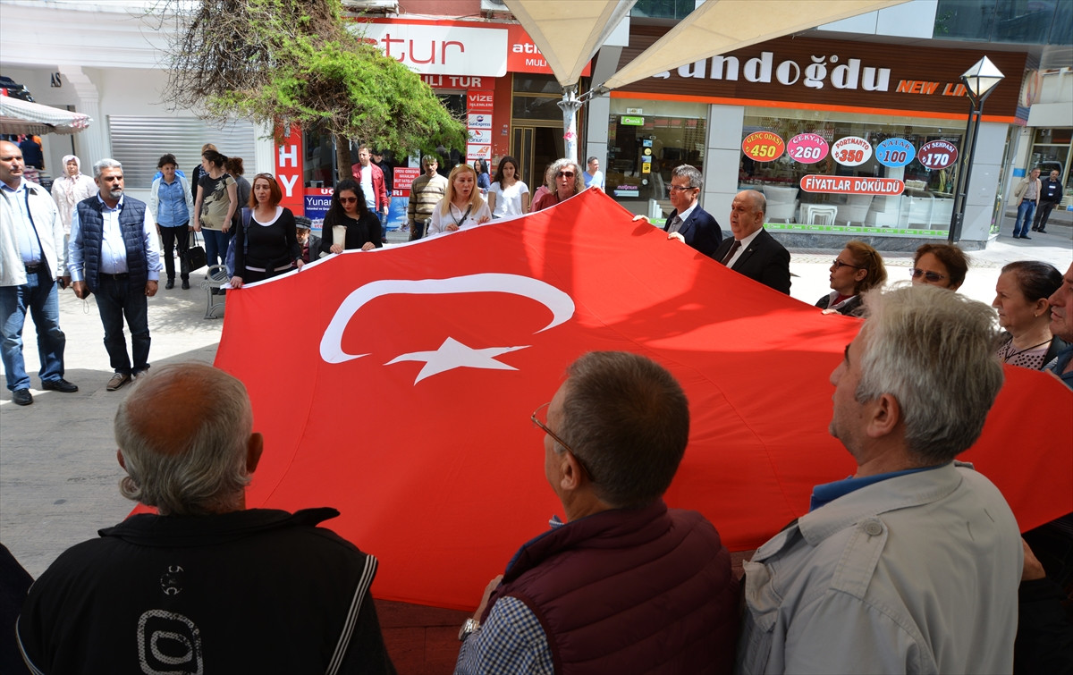 Tahıl Pazarı mevkisinde toplanan grup, dev Türk bayrağı açarak saygı duruşunda bulundu, İstiklal Marşı'nı okudu.