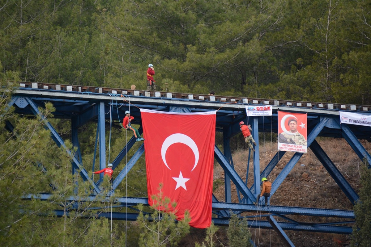 Osmaniye Dağcılık ve Doğa Sporları Kulübü (ODAK) üyeleri, Osmaniye'nin düşman işgalinden kurtuluşunun 95'inci yılı etkinlikleri kapsamında, Kanlı Geçit Tren Köprüsü'ne Türk bayrağı astı. Osmaniye Belediye Başkanı Kadir Kara, başkanlık makamında, Türk Bayrağını ODAK üyelerine teslim ettikten sonra yaptığı konuşmada, şanlı Türk bayrağının Kanlı Geçit Tren Köprüsü'ne asılmasının büyük anlam ifade ettiğini söyledi. Kanlı Geçit'in savaşların tarihindeki stratejik mekanlardan olduğunu ifade eden Kara, şöyle konuştu: "Bayrağın asıldığı yerde Kuvayımilliye ruhuyla mücadele eden Osmaniye'deki kuvvetlerin ortaya koymuş oldukları kahramanca mücadele var. Bu stratejik hareket neticesinde sadece Osmaniye'de değil Gaziantep, Şanlıurfa ve Kahramanmaraş'taki Kuvayımilliye kuvvetlerimizin direncinin artması ve oradaki mücadeleyi daha etkin bir şekilde vermeye katkı sağlamış oldu. Bu nedenle bayrağımızı asacağınız bölge önem arz ediyor. Şanlı bayrağımızı kanlı geçit bölgesine asmak üzere büyük bir onurla sizlere takdim ediyorum." Bayrak teslim törenine Türkiye Dağcılık Federasyonu Dağcılık Eğitmeni Yücel Erdoğan, ODAK Başkanı Muhammed Doğan ve kulüp üyeleri katıldı. Daha sonra ODAK üyeleri, bayrağı kurtuluş mücadelesinin kazanılmasında büyük öneme sahip Kanlı Geçit Tren Köprüsü'ne astı. Öte yandan köprüye, FETÖ'nün 15 Temmuz'daki darbe girişimi sırasında Ankara'da Özel Kuvvetler Komutanlığında darbeci generali vurduktan sonra şehit düşen Piyade Astsubay Ömer Halisdemir'in fotoğrafı da asıldı.