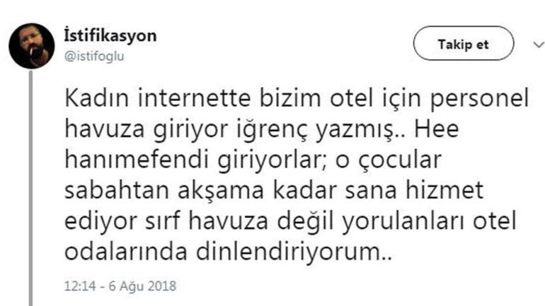 İstanbul’un Silivri ilçesindeki bir otelin sahibi Ahmet İstif’in Twitter hesabından yaptığı paylaşım, hem turizm sektörü çalışanları hem de birçok çevrede yankı uyandırdı. Bir kadın müşterinin internet üzerinden, "Personel havuza giriyor, iğrenç" şeklinde yorumda bulunması üzerine İstif, "Hee hanımefendi giriyorlar. O çocuklar sabahtan akşama kadar sana hizmet ediyor. Sırf havuza değil, yorulanları otel odalarında dinlendiriyorum" paylaşımında bulundu.