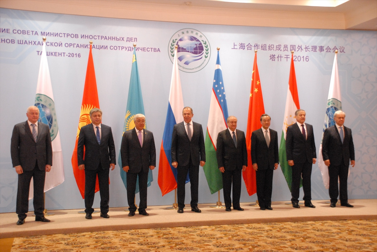 Örgüte üye Rusya, Çin, Kazakistan, Kırgızistan, Tacikistan ve Özbekistan dışişleri bakanlarının Taşkent'te başlayan toplantısı öncesinde hatıra fotoğrafı çektirilmesinin ardından toplantı salonuna geçildi.