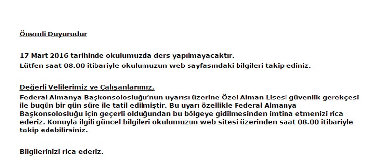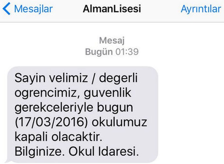 Alman Lisesi'nden velilere gönderilen mesajda, "Sayın velimiz / değerli öğrencimiz, güvenlik gerekçeleriyle bugün (17/03/2016) okulumuz kapalı olacaktır" denildi.