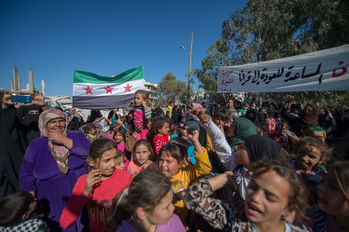 Özellikle terör örgütü PYD'nin baskıları nedeniyle ilçeye gelen Suriyeliler ise örgüte tepki göstermek amacıyla cuma namazı sonrası Saray Meydanı'nda toplandı. Aralarında kadın ve çocukların da bulunduğu grup, ellerindeki bayraklarla "Suriye'ye özgürlük, PYD dışarı" sloganları atarak, uzun süre yürüdü.