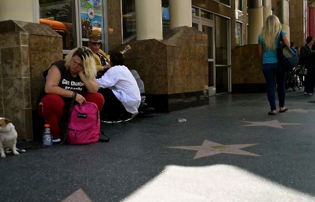 Kaldırımları Hollywood yıldızlarının isimleriyle dolu olan Hollywood Bulvarı'nda yürürken; turistler battaniyeleriyle yerde yatan evsizlerin üzerinden atlamak, mağaza sahipleri de idrar kokusundan kurtulmak için sıklıkla dükkânlarının önünü yıkamak zorunda kalıyor.