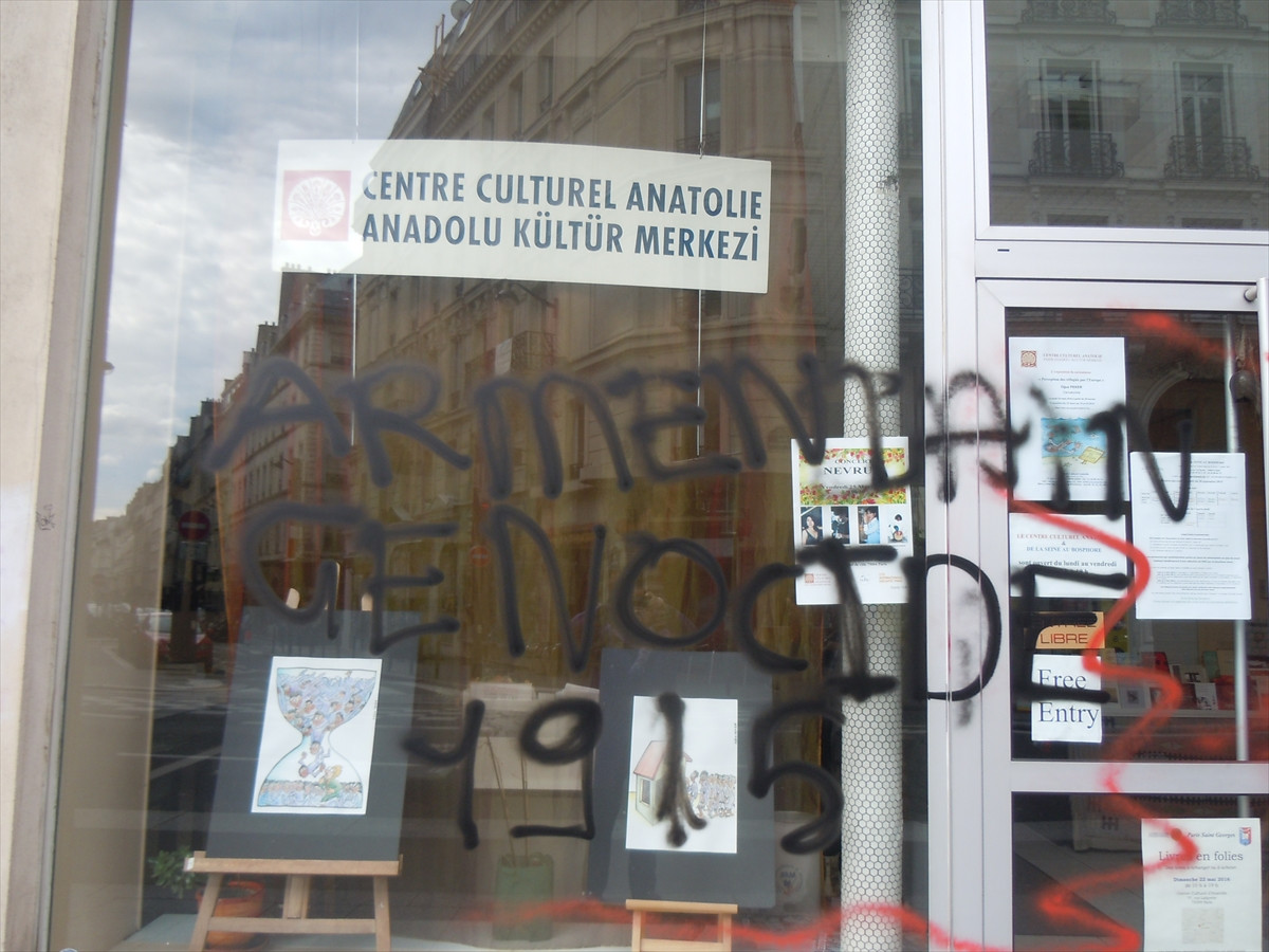 Anadolu Kültür Merkezi'nden yapılan yazılı açıklamaya göre, önceki gece merkezin camlarına sprey boyalarla 1915 olaylarına ilişkin Ermeni iddialarıyla ilgili ve Cumhurbaşkanı Recep Tayyip Erdoğan aleyhine sloganlar yazıldı.