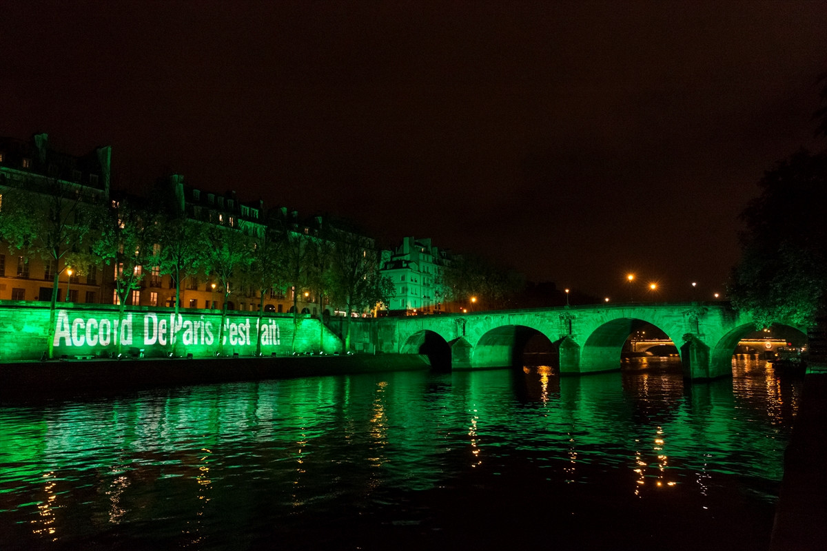 Paris Belediyesinin düzenlediği etkinlik dolayısıyla, tamamen yeşil renge bürünen bu mekanların üzerine yine ışıklandırma sistemiyle "Paris İklim Anlaşması artık yürürlükte" yazıldı. Bu anlaşmanın yürürlüğe girmesiyle uluslararası anlamda hukuki bağlayıcılığı olan anlaşmayı imzalayan ve parlamentolarında onaylayan ülkelerin sera gazı salınımını azaltma ve küresel sıcaklık artışının 2 derecenin altında tutulması konusunda planlarını uygulamaya koyması gerekecek. Anlaşmanın yürürlüğe girmesi için küresel sera gazı salınımının en az yüzde 55’ini oluşturan ve en az 55 ülkenin parlamentoları tarafından onaylanması şartı yerine getirildi.