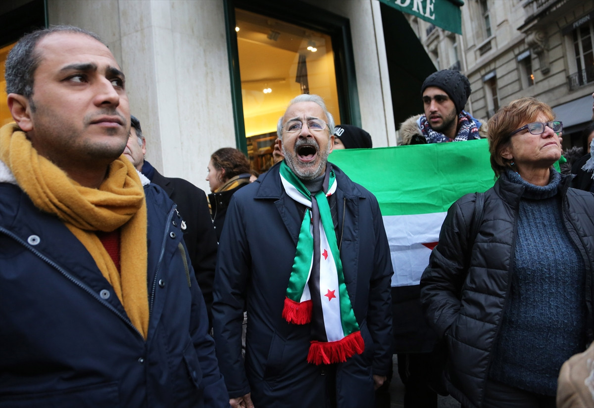 Elysee Cumhurbaşkanlığı Sarayı ve İçişleri Bakanlığı yakınında toplanan yüzden fazla kişi, Fransız yetkililere ve uluslarası topluma rejim ve destekçilerinin özellikle Doğu Halep'te imza attığı katliama sessiz kalmamaları çağrısında bulundu.