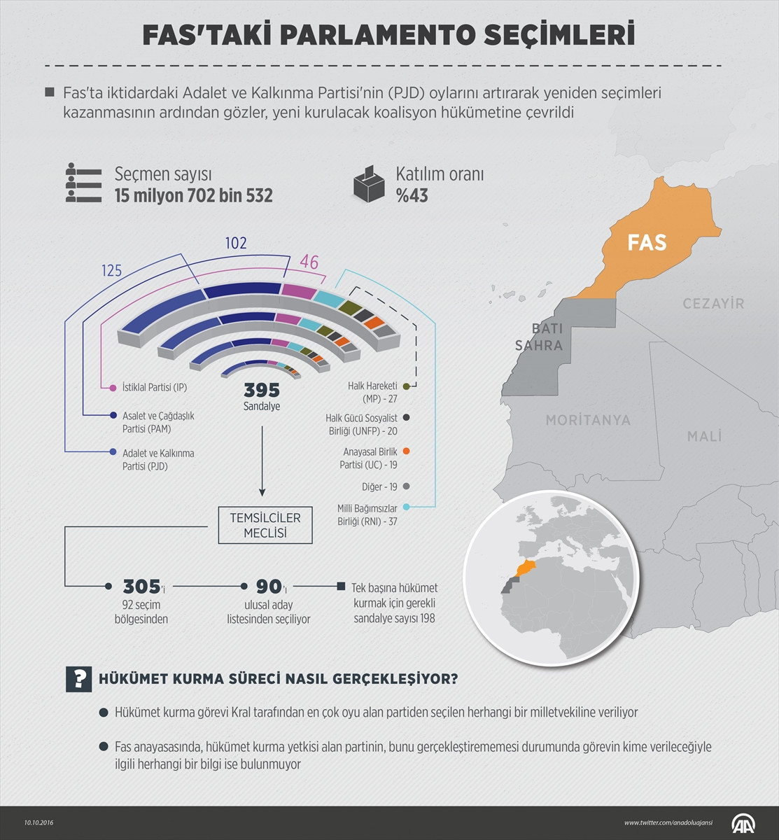 PJD, Fas Kralı 6. Muhammed'in danışmanlığını yapan Fuad Ali el-Himme'nin Asalet ve Çağdaşlık Partisi (PAM) ve bir önceki hükümeti kuran İstiklal Partisi'nin (İP) önünde seçimi tamamlayarak hükümeti kurmaya hak kazandı.