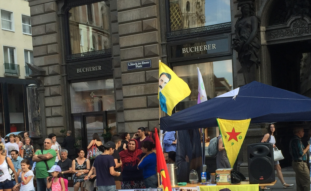 Resmi kurumlardan izin alan PKK sempatizanları, Viyana'nın merkezi Stefanplatz Meydanı'nda açtıkları stand çevresinde ve Viyana polisinin güvenlik önlemleri altında Türkiye ve Cumhurbaşkanı Recep Tayyip Erdoğan aleyhine propaganda yapıyor.