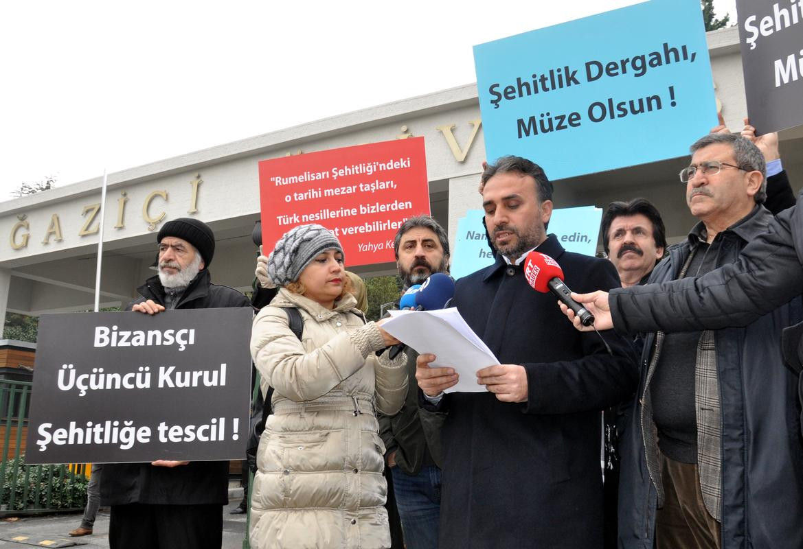 Türkiye Yazarlar Birliği İstanbul Şubesi üyeleri, Boğaziçi Üniversitesi Güney Kampüsü Etiler kapısında bir araya geldi. Grup, "Şehitlik Dergahı müze olsun", "Rumeli Hisarı Şehitliği'ndeki o tarihi mezar taşları, Türk nesillerine bizlerden fazla hayat verebilir", "Padişah odasını yeniden yapın, Bizans Merkezini uzaklaştırın" yazılı pankart açtı.