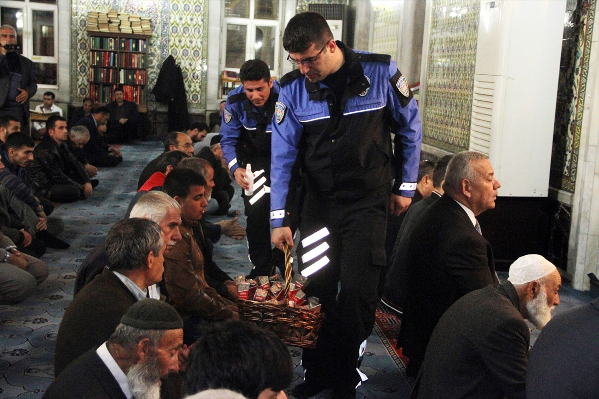 İl Emniyet Müdürlüğünce camiye gelen vatandaşlara gül suyu ve mevlit şekeri dağıtıldı.