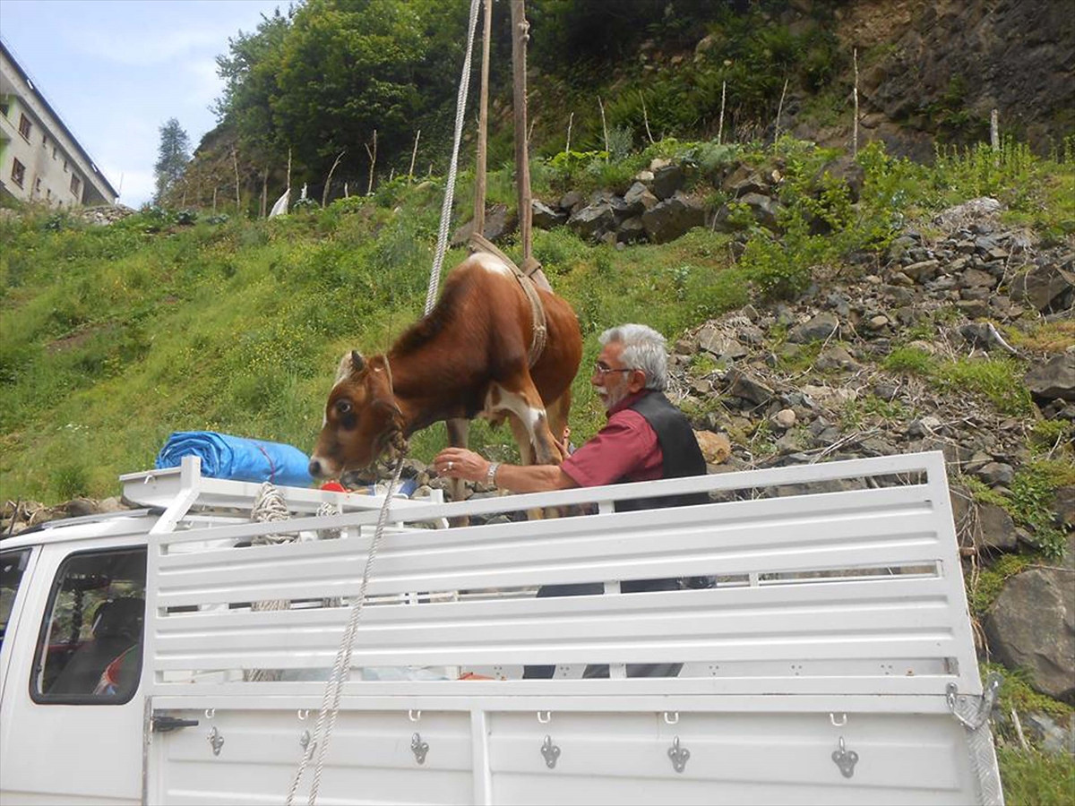 Esir ile Andon Su İşleri Müdürü Birol Durmuş'un haber verdiği Rize Belediyesi itfaiye ekipleri, ineği bulunduğu yerden çıkarmak için yoğun çaba gösterdi.