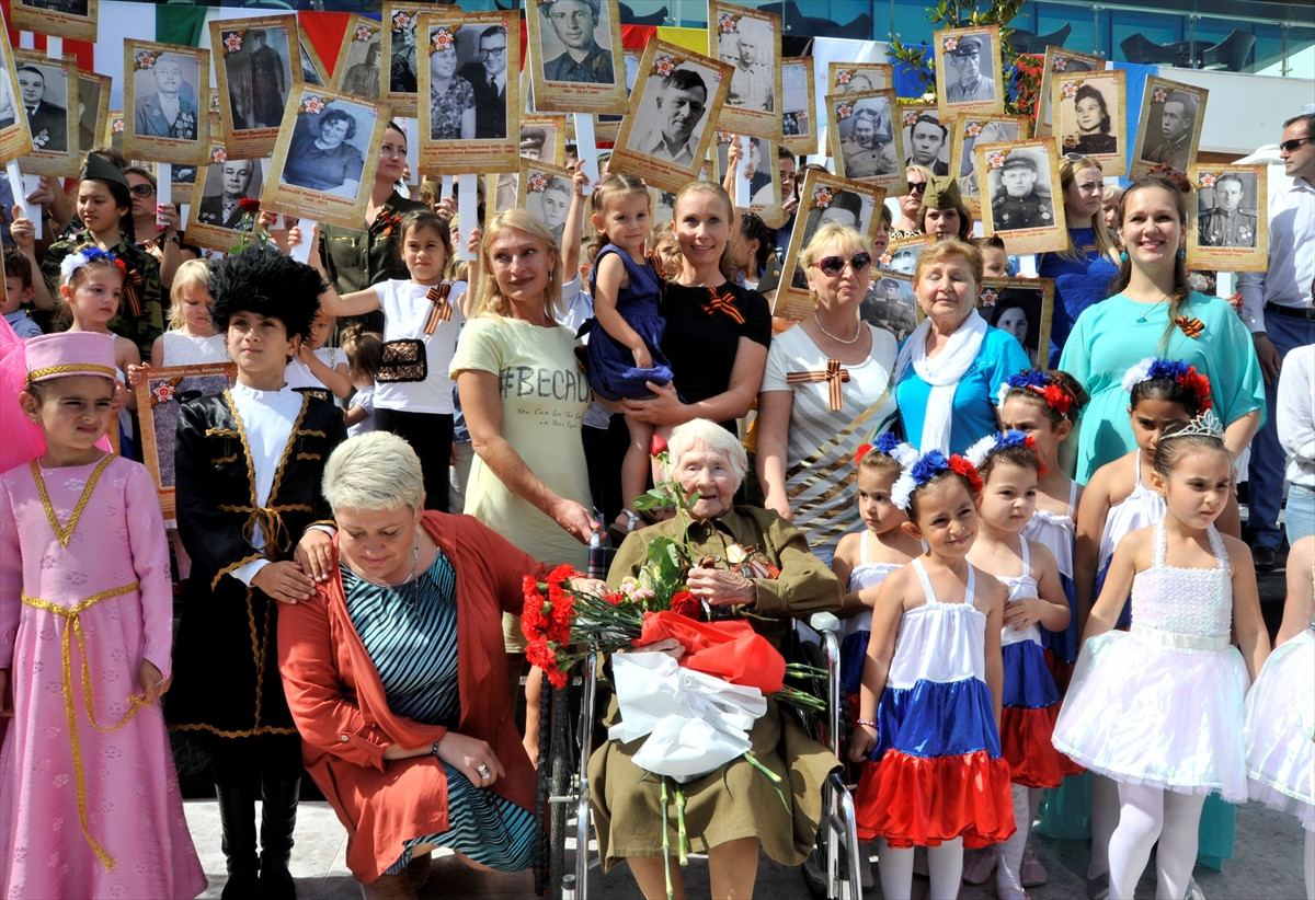Ayrıca, 2. Dünya Savaşı'na katılan ve halen Antalya'da yaşayan 8 şeref madalyası sahibi Valentina Lyatifov için tören düzenlenirken, çocuklar kendisine çiçek verdi.