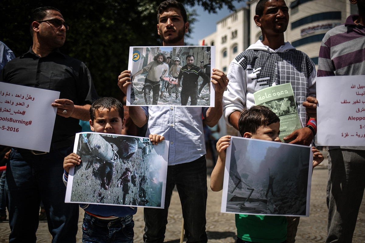 Suriyeli Aileler Topluluğunun Gazze'deki Meçhul Asker Meydanı'nda düzenlediği gösteride, uluslararası toplumdan Halep'e yönelik hava saldırılarının sona ermesi için harekete geçmesi talep edildi.