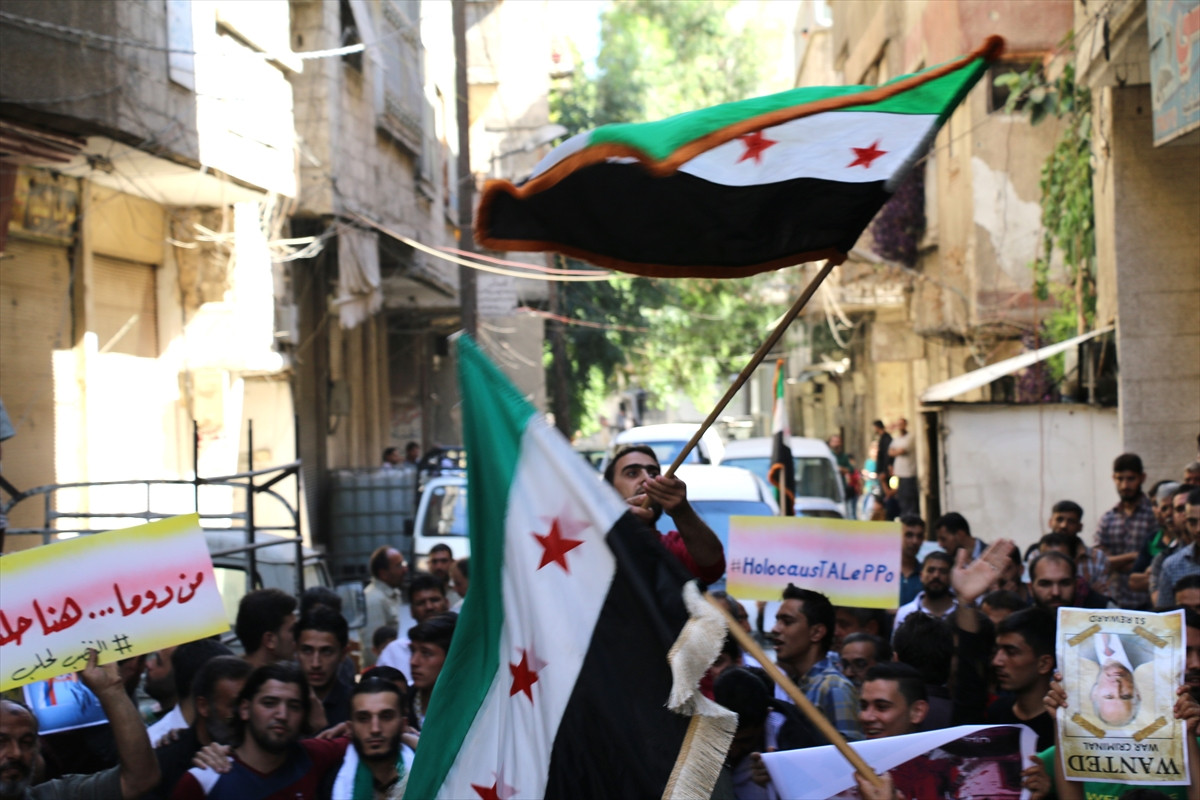 ŞAM (AA) - Rusya'nın Suriye'de halka yönelik saldırıları, 1'inci yılında başkent Şam'ın doğusundaki ilçe ve beldelerde protesto edildi.