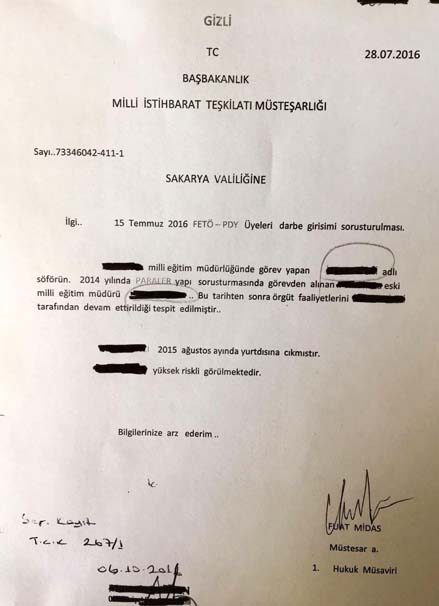 Levent A. (34), Sakarya Valiliğine MİT'te görevli F.M. adına dilekçe vererek, aralarında husumet bulunduğu öğrenilen akrabasını FETÖ ile bağlantılı olduğu iddiasıyla ihbar etti.