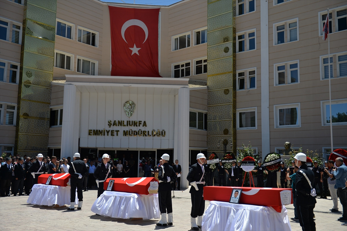 ŞANLIURFA (AA) - Şanlıurfa Şehirlerarası Otobüs Terminali'nde çıkan çatışmada şehit olan polis memurları Mehmet Ünaldı (35), Hasan Hüseyin Çalışkan (33) ve Sinan Akdemir (27) için tören düzenlendi.