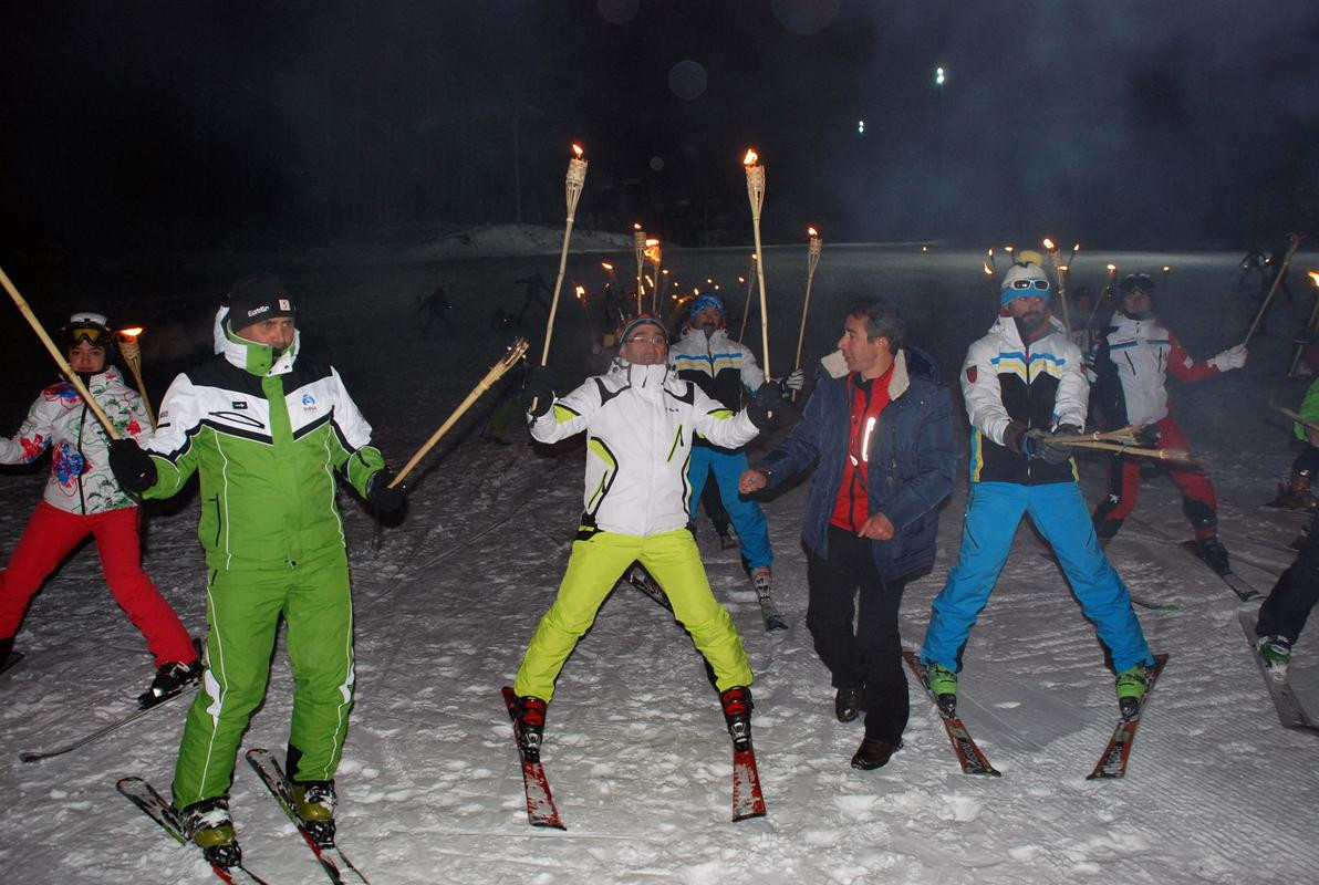 Genç kayakçıların, meşaleli kayak gösterisini de izleyen Kılıç, eline aldığı meşaleyle kayak merkezinde bezle sarılı demirler üzerindeki "Ruhunuz şad olsun" yazısını ateşledi.