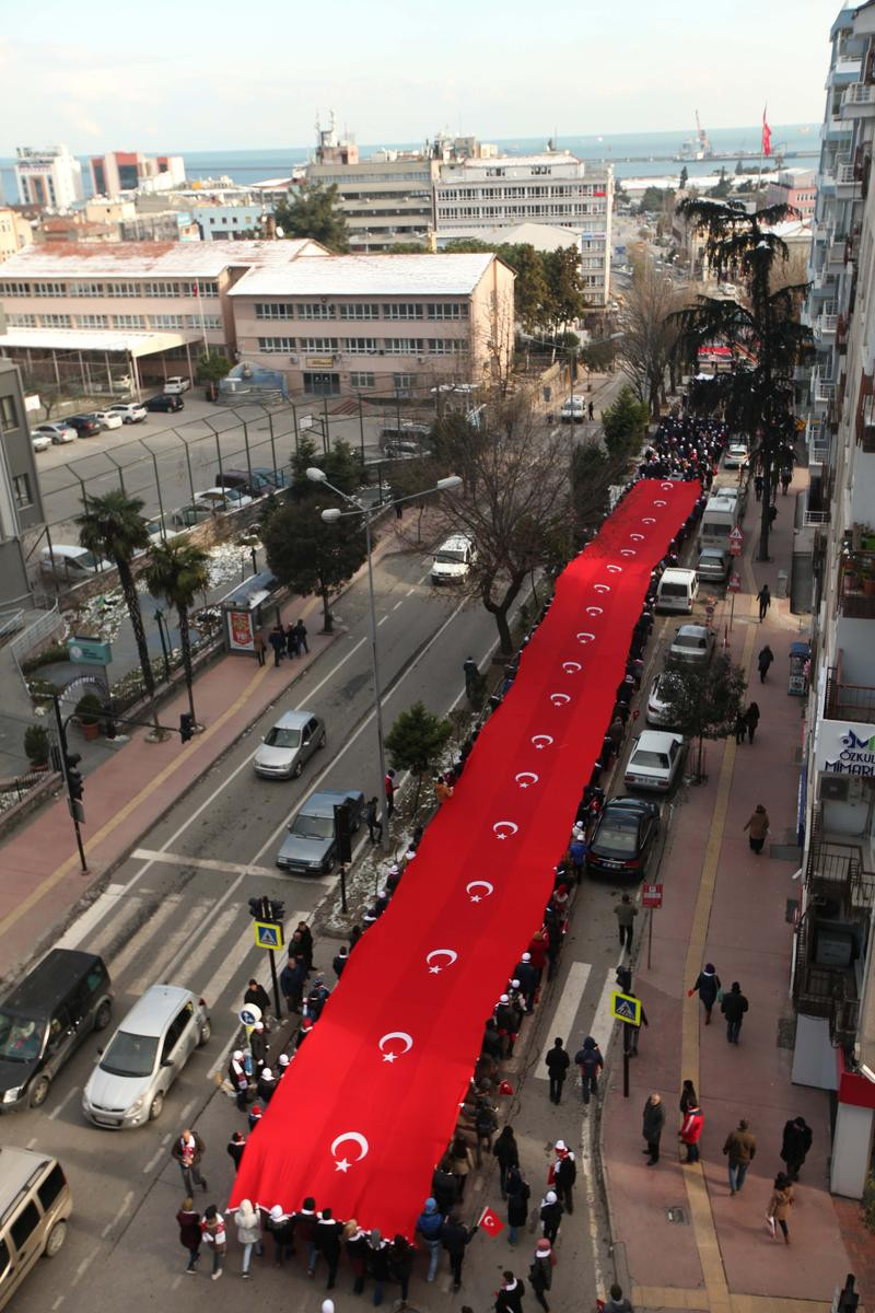 Saraydüzü Kışlası önünde toplanan öğrenciler, vatandaşlar ve il protokolü, Türk bayrakları ve Atatürk posterleriyle Şehzadeler Geziyolu'na kadar yürüdü.