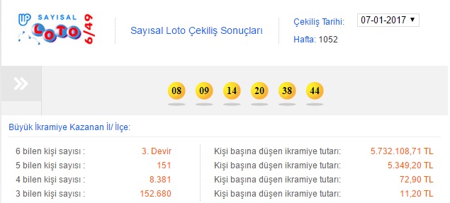 Sayısal Loto 1052. Hafta çekilişi yapıldı. Milli Piyango İdaresi (MPİ) Genel Müdürlüğünden yapılan açıklamaya göre, bu haftaki çekilişte 6 bilen yine çıkmadı ve Sayısal Loto üst üste üçüncü kez devretti. 5 bilen 151 kişi 5 bin 349 lira 20 kuruş, 4 bilen 8 bin 381 kişi 72 lira 90 kuruş, 3 bilen 152 bin 680 kişi 11 lira 20 kuruş ikramiye kazandı. İşte Sayısal Loto'da kazandıran numaralar.