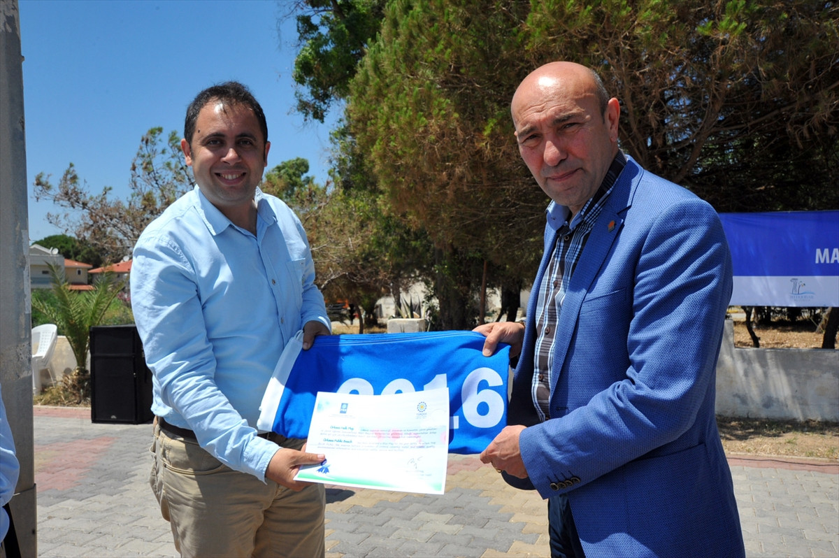 Ürkmez Sağlık Ocağı Plajı'nda düzenlenen törende, Seferihisar Belediye Başkanı Tunç Soyer, mavi bayrağı, TÜRÇEV Kuzey Ege İlleri Koordinatörü Doğan Karataş'ın elinden aldı.