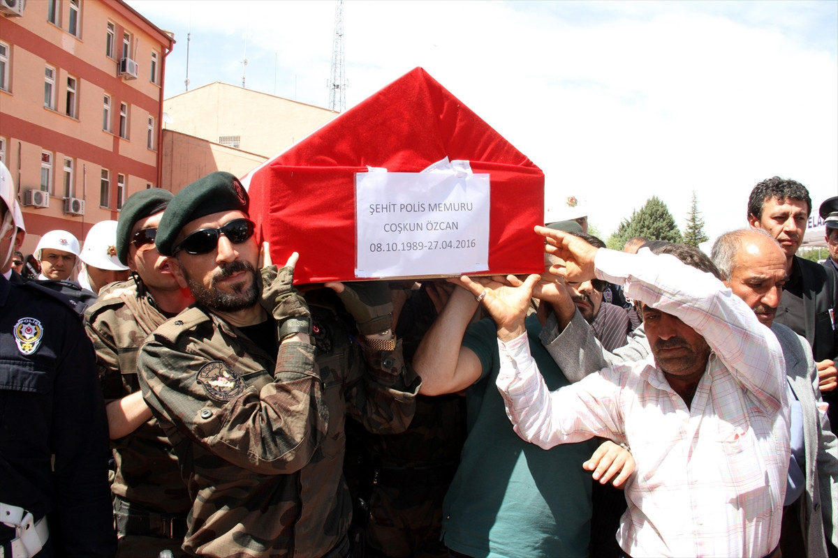 Muş'ta terör örgütü PKK'nın yola yerleştirdiği el yapımı patlayıcının infilak ettirilmesi sonucu 28 yaşında şehit olan polis memuru Coşkun Özcan için memleketi Elazığ'da tören yapıldı. Elazığ Emniyet Müdürlüğü bahçesinde düzenlenen törende şehidin Türk bayrağına sarılı naaşının katafalka konulmasının ardından öz geçmişi okundu ve dua edildi. Muş Valisi Seddar Yavuz, törende yaptığı konuşmada, ülkenin birliğine ve bütünlüğüne kasteden hainlerin dün yine kalleşçe ve alçakça saldırdıklarını söyledi. Özellikle Varto bölgesinde yaklaşık 8 aydır sözde Erzurum eyaleti güçlü yürütme kurulu üyesi ve Karlıova sorumlusu da dahil birçok hainin ölü ya da sağ olarak ele geçirildiğini anımsatan Yavuz, şunları söyledi: "Dün Varto bölgesinde bombalı saldırı neticesinde maalesef polis memurumuzu kaybettik ve şu anda iki de yaralımız var. Onlara da acil şifalar diliyorum. Bizler iman etmiş insanlarız. Yüce Allah Kur'an-ı Kerim'de buyuruyor ki 'Allah yolunda öldürülenlere ölüler demeyiniz, bilakis onlar diridirler.' Biz bu imanla yola çıktık. Bu vatanı ve ülkeyi asla böldürmeyeceğiz. Her birimiz bu vatan, millet ve bu din için mücadele etmeye sonuna kadar devam edeceğiz. Şehidimize Allah'tan rahmet diliyorum. Şehidimizin yakınlarına Rabbim sabırlar versin." Yavuz, en kısa zamanda hainlerin mutlak suretle peşine düşeceklerini ve hesabını da soracaklarını vurguladı. Elazığ Müftüsü Peyami Güngör'ün okuduğu duanın ardından, Özcan'ın cenazesi defnedilmek üzere merkeze bağlı Yurtbaşı beldesine gönderildi. Törene, 15 aylık bebeği İpek Sena ile katılan şehidin eşi Nida, annesi Müsevet ve babası Mustafa Özcan, gözyaşı döktü. Mesai arkadaşları tören boyunca şehidin naaşının başında gözyaşları içinde nöbet tuttu. Meslektaşları, tekbir getirerek cenaze aracına kadar şehidin naaşını omuzladı. Törene, şehidin ailesi ve yakınları ile Elazığ Valisi Murat Zorluoğlu, AK Parti Elazığ Milletvekili Ejder Açıkkapı, Belediye Başkanı Mücahit Yanılmaz, AK Parti İl Başkanı Ramazan Gürgöze, Emniyet Müdürü Nihat İşlek, askeri ve mülki erkan katıldı. Dün, Muş-Varto karayolunun ilçeye 15 kilometre mesafedeki Taşdibek köyü mevkisinde yola yerleştirilen el yapımı patlayıcının, özel harekat polislerini taşıyan zırhlı aracın geçişi sırasında infilak ettirilmesi sonucu polis memuru Özcan şehit olmuş, 2 polis de yaralanmıştı.