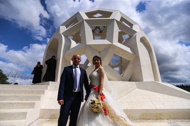 Emre ve Merve Tıraş çifti de nikah törenine gitmeden önce Şehitler Makamı'nı ziyaret ederek darbe girişimi gecesinde şehit olanlar için dua etti.