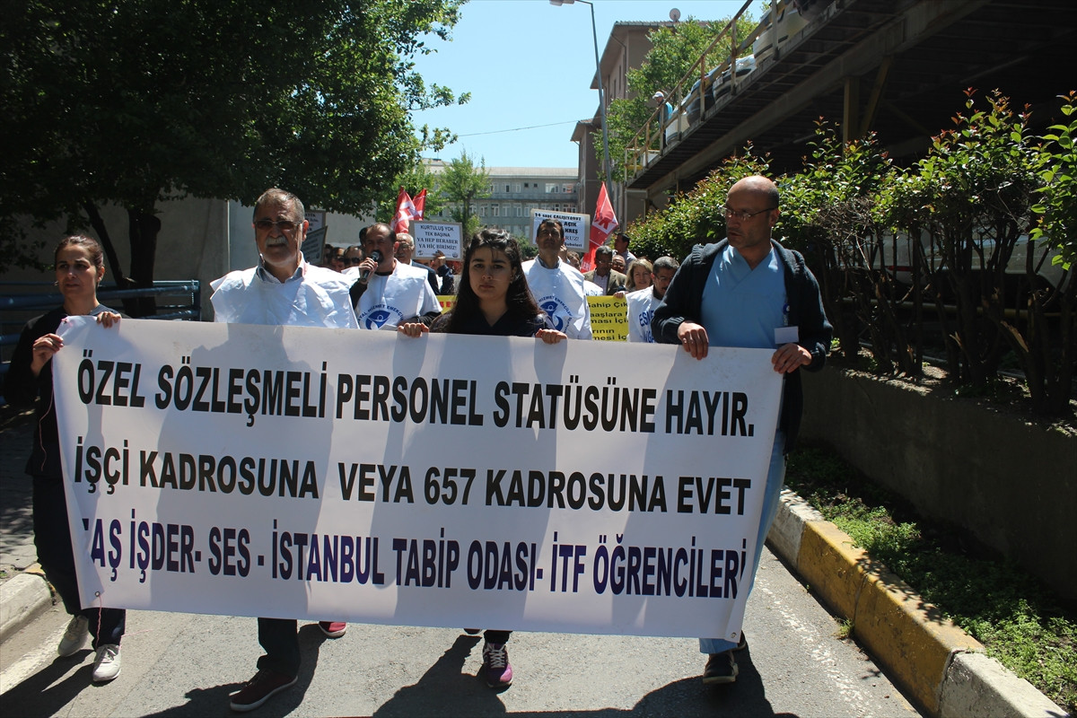 İstanbul Üniversitesi İstanbul Tıp Fakültesi önünde toplanan SES üyeleri, "Yaşasın Birlik Mücadele Dayanışma Günü 1 Mayıs" yazılı pankart açtı.