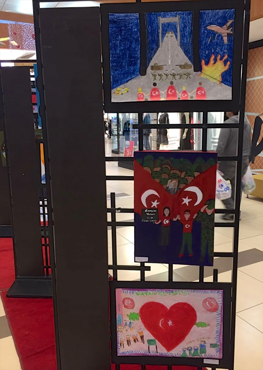 Çocukların duygularını aktardıkları 30 resmin vatandaşlarla buluştuğu sergide, askerler tarafından vurulan sivil vatandaşlar, sokaklarda yürütülen tanklar ve tankların altına yatan ve önünde duran kahramanlar, ellerinde Türk bayraklarıyla demokrasi nöbeti tutan vatandaşlar, şiirler ve camiler yer alıyor.