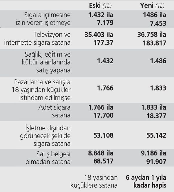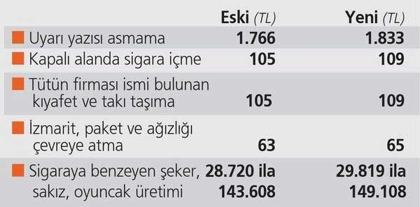 Sigaranın ardından sigara cezaları da zamlandı. 1 Ocak'tan geçerli sigara cezaları yüzde 3.83 oranında artırıldı. sağlık Bakanlığı, yeni listeyi illere göndererek bu tarife üzerinden ceza kesilmesini istedi. Buna göre sigaraya benzeyen sakız ve şeker üretene 149 bin lira, televizyonda ve internette sigara satana 183 bin TL ceza kesilecek. Kapalı alanda sigara içmenin cezası ise 105 TL'den 109 TL'ye yükseldi.