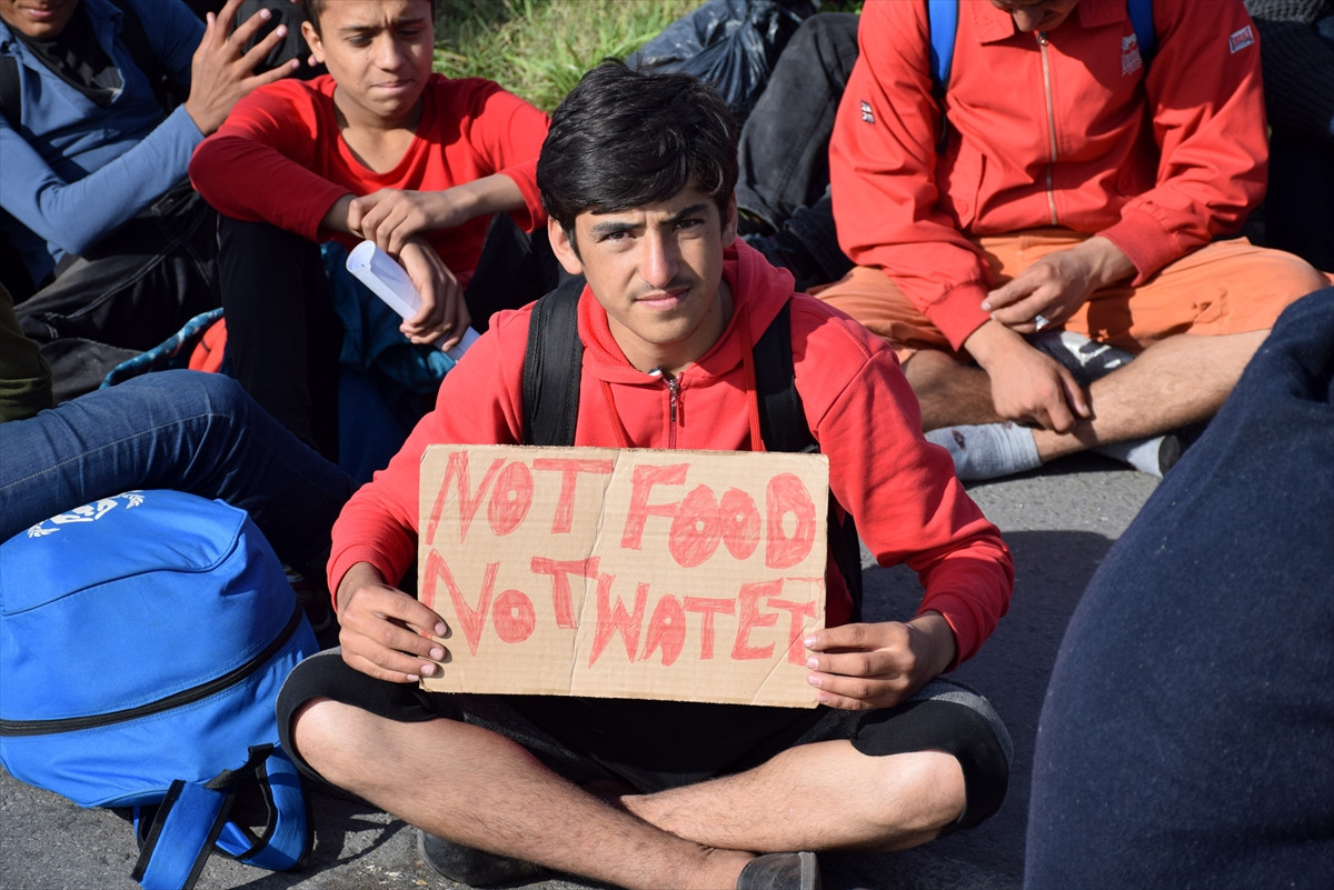Polis eşliğinde yürüyen sığınmacılar, üzerinde "Lütfen, Macaristan sınırlarını açın", "Yiyecek ve su. Başka ihtiyacımız yok. Sınırların açılmasına ihtiyacımız var." yazılı dövizler taşıdı.