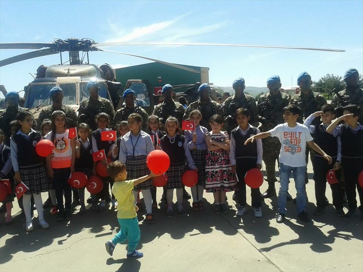 Öğrenciler, pistteki helikopterlerin yanına giderek pilotlarla konuştu. Helikopterlere binen öğrenciler, daha sonra tam teçhizatlı komandoları ziyaret ederek selam verdi. Öğrenciler, operasyona gidecek askerler için de dua etti.