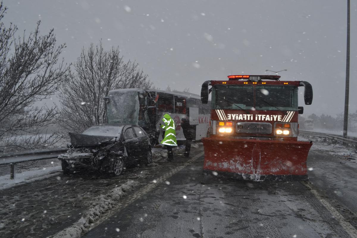 Alınan bilgiye göre, Kınalı gişeleri mevkisinde kar yağışı ve yolun buz tutması nedeniyle 2 yolcu otobüsü, 5 tır ve cip ve otomobillerin arasında olduğu 13 aracın karıştığı zincirleme trafik kazası meydana geldi.