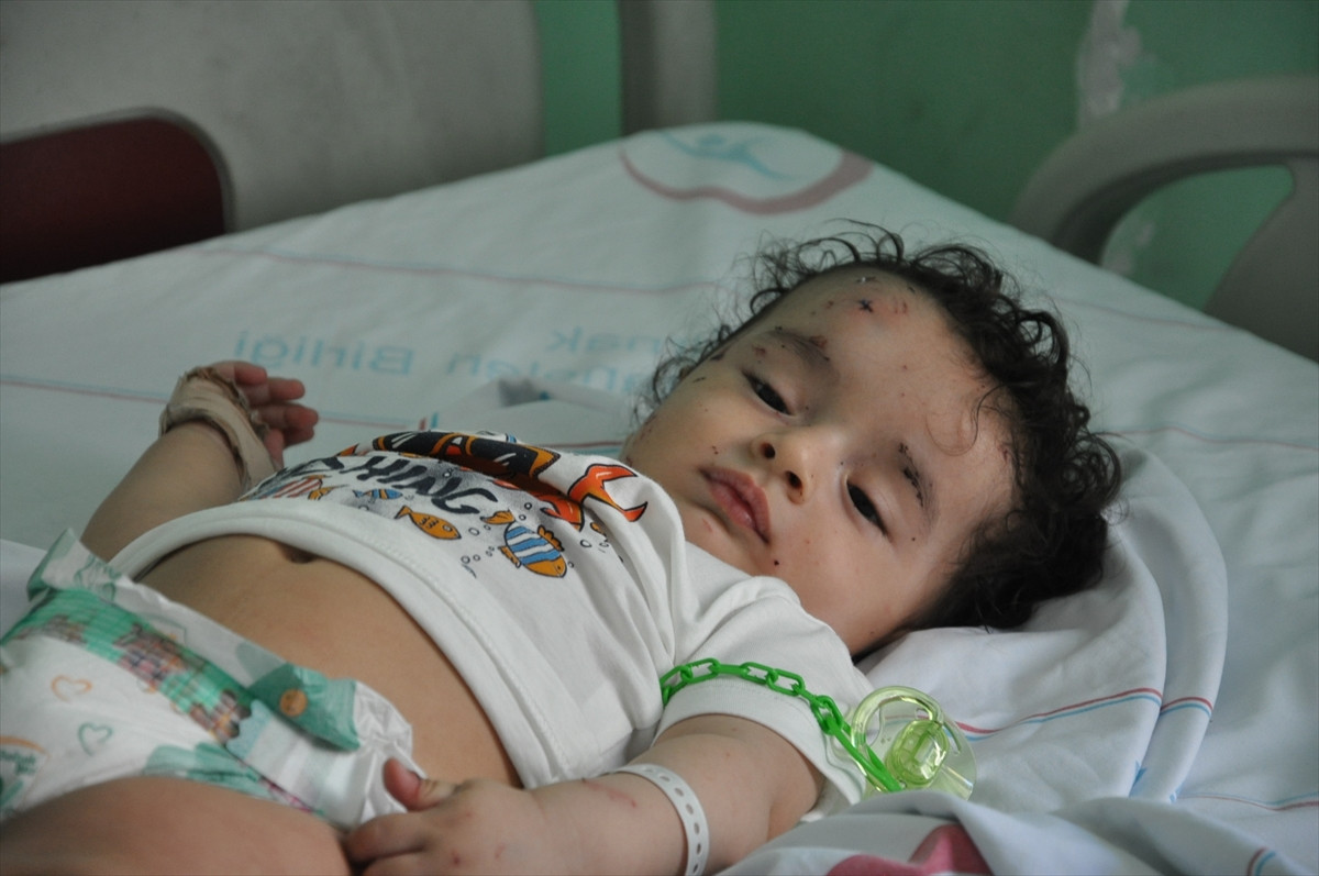 Terör saldırısının küçük mağduru Yusuf bebek, her şeyden habersiz bir yandan emziği ile oynarken bir yandan da yüzündeki yaralara rağmen çevresine gülücük dağıtıyor.