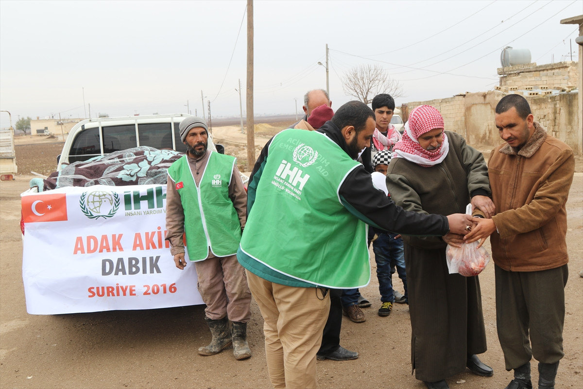Açıklamada, "Fırat Kalkanı Harekatı" sonrası güvenliğin sağlandığı Suriye'nin Dabık kentinde yaşayan 400 aileye ulaşıldığı anımsatılan açıklamada, "İnsani Yardım Vakfı, duyarlı insanlarca bağışlanan 53 adak kurbanlarının kesimi Dabık kent merkezinde gerçekleştirdi. Bu kurbanlara ait etleri aralarında öğretmen ve yetim çocukları bulunan ailelerin de bulunduğu 400 aileye ulaştırıldı." ifadelerine yer verildi.