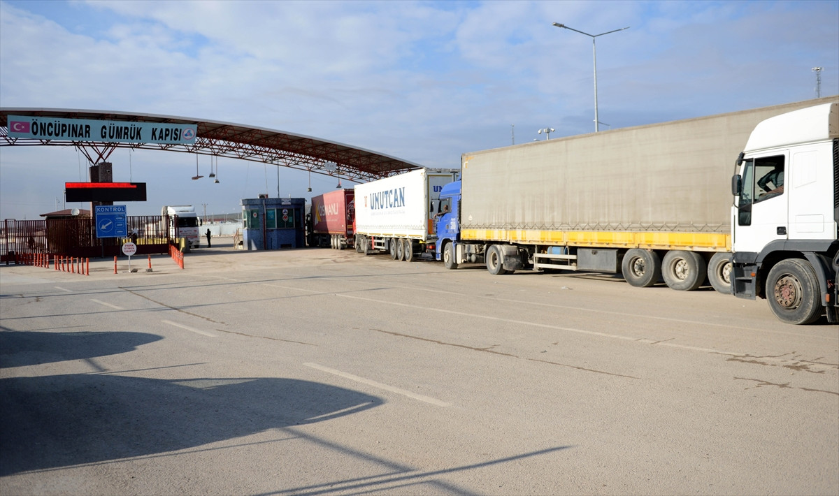 Çatışmalar nedeniyle evlerini terk etmek zorunda kalan Suriyeliler için hazırlanan gıda, meyve, sebze, tavuk ile giyim, kömür, battaniye, ayakkabı, çocuk bezi ve mamadan oluşan yardım malzemelerinin yüklendiği tırlar, Öncüpınar Gümrük Kapısı'ndaki işlemlerin ardından tampon bölgedeki Suriye plakalı araçlara nakledildi.