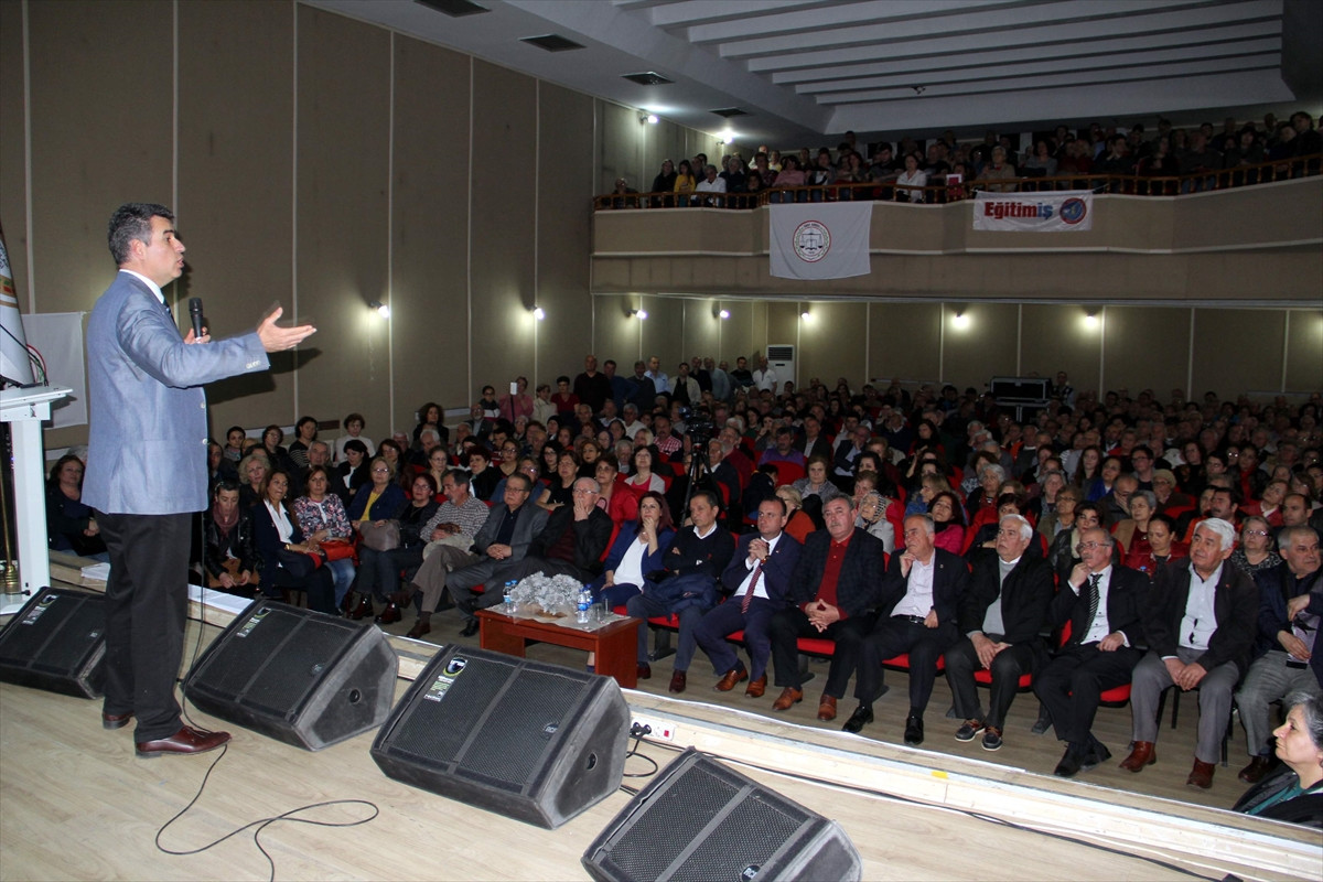 Konferans salonunda Belediye Başkanı Baki Ergül, Feyzioğlu’na çiçek takdim etti.