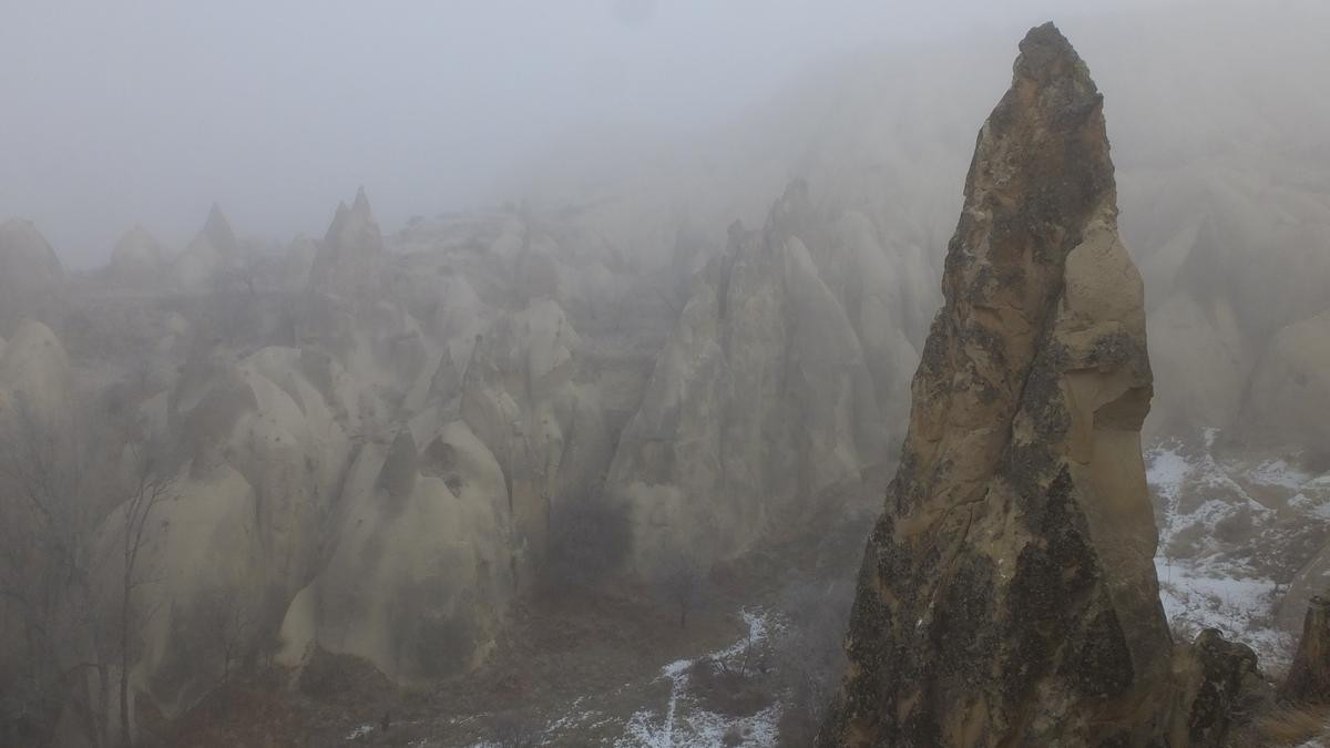 NEVŞEHİR (AA) - Peribacaları, kayadan oyma evleri ve kiliseleriyle yerli ve yabancı turistlerin ilgisini çeken Kapadokya'da, sabah saatlerinde etkili olan sis nedeniyle, görüş mesafesi yer yer 30 metreye kadar düştü.