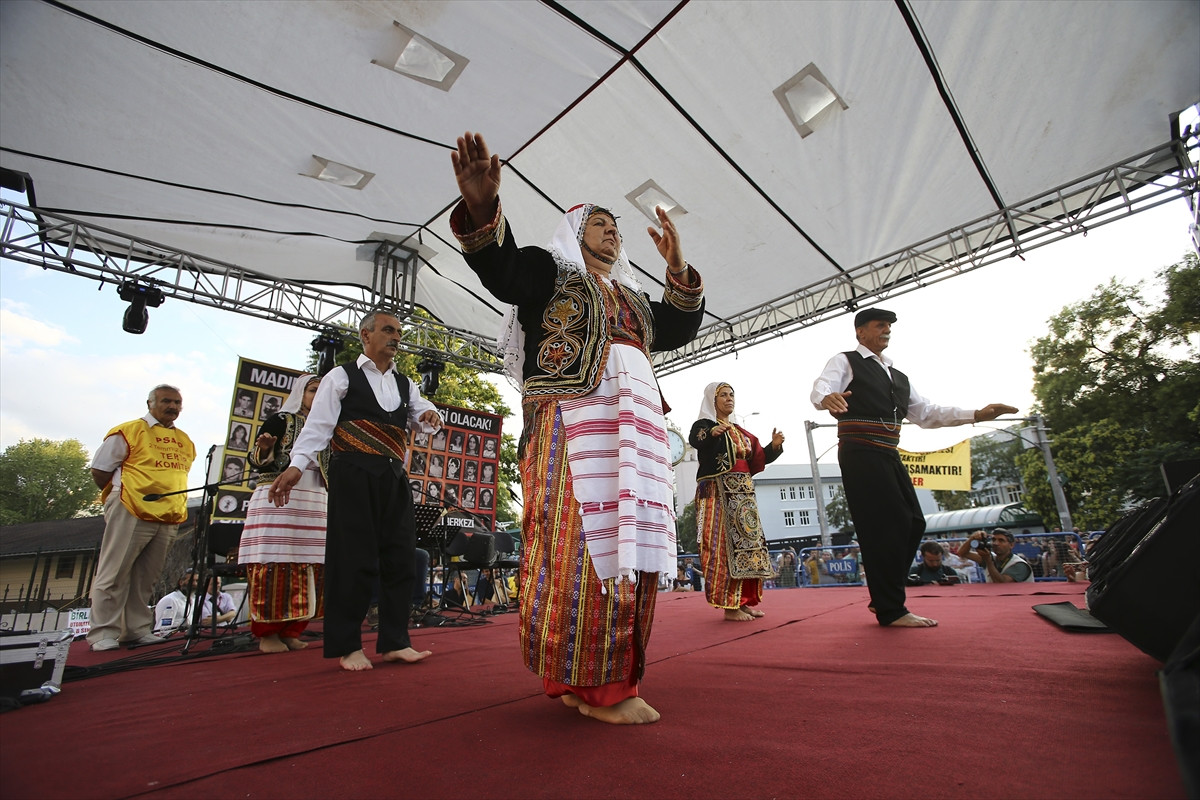 Saygı duruşunun ardından, Sivas olaylarında hayatını kaybedenlerin isimleri okundu. Gruptakiler, anons edilen her ismin ardından "burada" dedi. Çeşitli sloganlar atıp, afiş ve pankart açan grup, semah gösterisi ve türkülerle etkinliklerine devam etti.