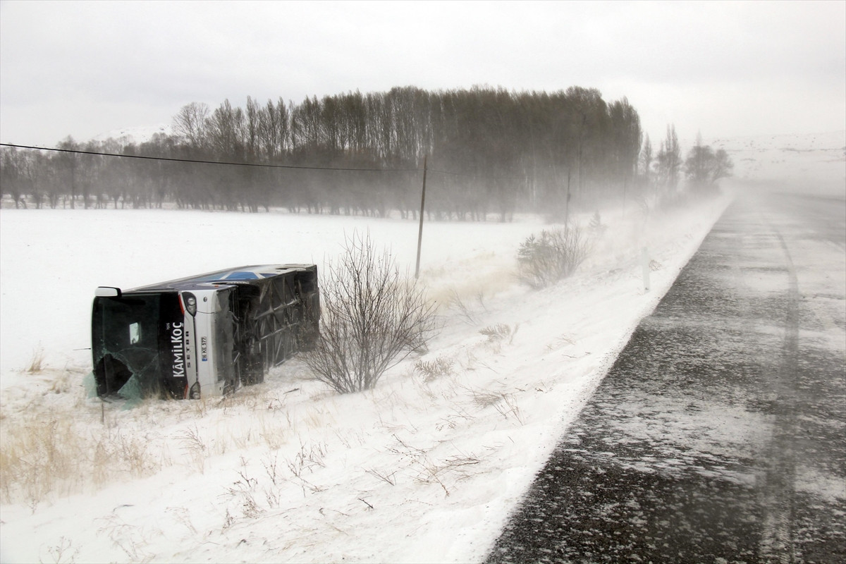 Bursa'dan Erzurum istikametine seyreden Adnan Uçan (50) yönetimindeki 34 MKG 35 plakalı yolcu otobüsü, Sivas-Erzincan karayolunun Gökdin köyü yakınlarında kar ve tipi nedeniyle buzlanan yolda devrildi.